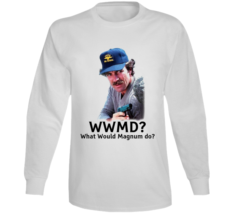 You will be sure to enjoy this Wwmd What Would Magnum Do Tom Selleck Long Sleeve T Shirt which is available on a White 100% Cotton Tee. The Wwmd What Would Magnum Do Tom Selleck Long Sleeve T Shirt is available in youth, kids and adult sizes which you can select from the shirt size drop down below. T-Shirt is shipped out via USPS first class mail with tracking number.