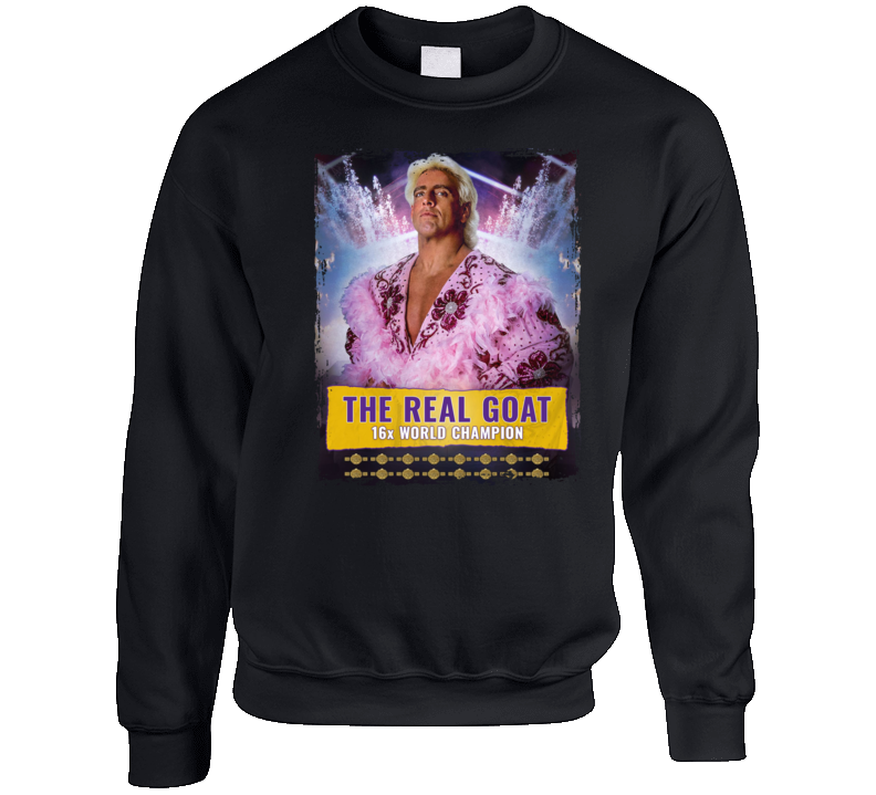 You will be sure to enjoy this Ric Flair The Real Goat Crewneck Sweatshirt which is available on a Black 100% Cotton Tee. The Ric Flair The Real Goat Crewneck Sweatshirt is available in youth, kids and adult sizes which you can select from the shirt size drop down below. T-Shirt is shipped out via USPS first class mail with tracking number.