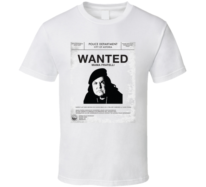 You will be sure to enjoy this Wanted Mama Fratelli Parody Goonies Movie T Shirt which is available on a White 100% Cotton Tee. The Wanted Mama Fratelli Parody Goonies Movie T Shirt is available in youth, kids and adult sizes which you can select from the shirt size drop down below. T-Shirt is shipped out via USPS first class mail with tracking number.