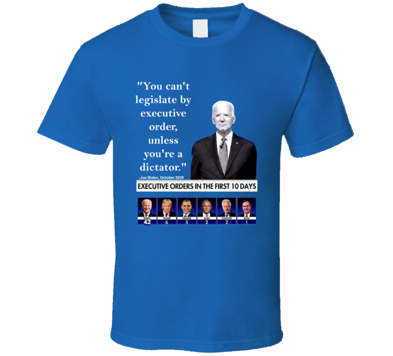 You will be sure to enjoy this You Can't Legislate By Executive Order Joe Biden Quote T Shirt which is available on a Royal Blue 100% Cotton Tee. The You Can't Legislate By Executive Order Joe Biden Quote T Shirt is available in youth, kids and adult sizes which you can select from the shirt size drop down below. T-Shirt is shipped out via USPS first class mail with tracking number.