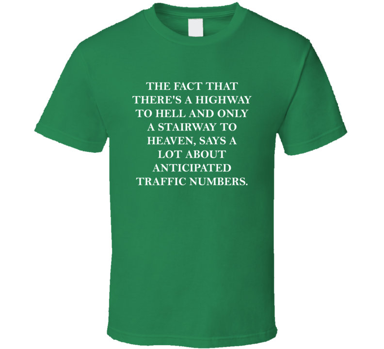 You will be sure to enjoy this Highway To Hell Stairway To Hell T Shirt which is available on a Irish Green 100% Cotton Tee. The Highway To Hell Stairway To Hell T Shirt is available in youth, kids and adult sizes which you can select from the shirt size drop down below. T-Shirt is shipped out via USPS first class mail with tracking number.