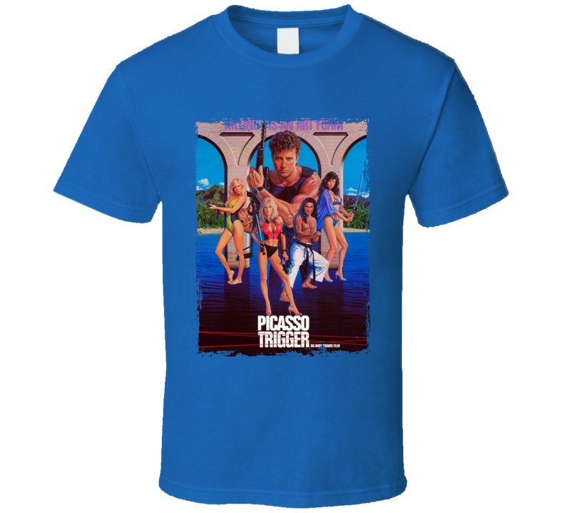 You will be sure to enjoy this Picasso Trigger 80s Action Movie Fan T Shirt which is available on a Royal Blue 100% Cotton Tee. The Picasso Trigger 80s Action Movie Fan T Shirt is available in youth, kids and adult sizes which you can select from the shirt size drop down below. T-Shirt is shipped out via USPS first class mail with tracking number.