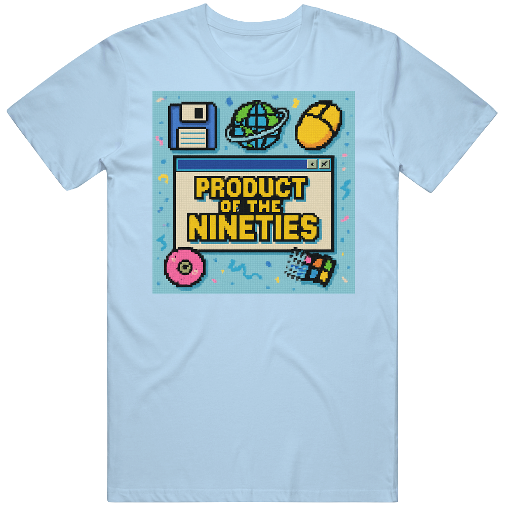 You will be sure to enjoy this Product Of The Nineties 90s Tech T Shirt which is available on a Light Blue 100% Cotton Tee. The Product Of The Nineties 90s Tech T Shirt is available in youth, kids and adult sizes which you can select from the shirt size drop down below. T-Shirt is shipped out via USPS first class mail with tracking number.