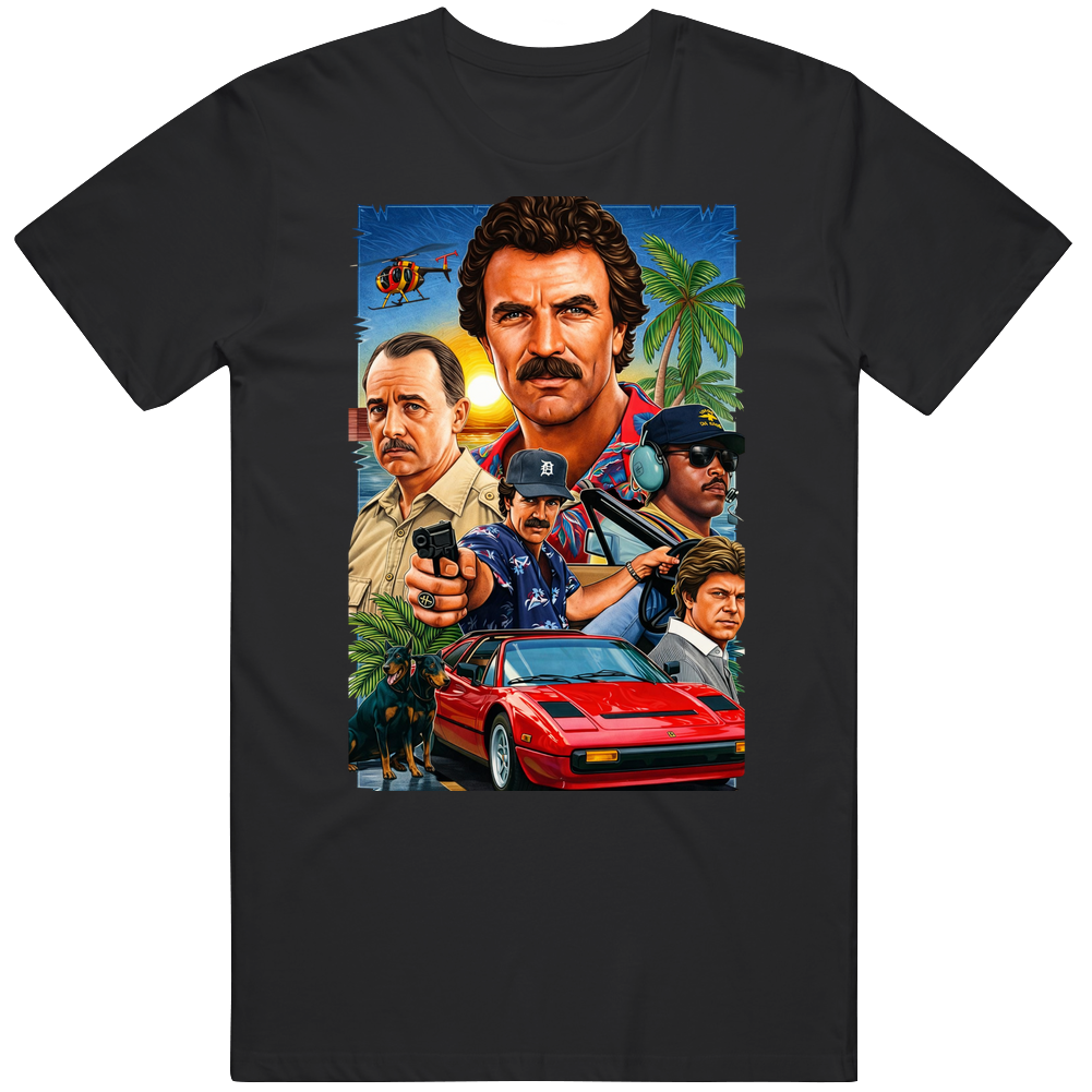 You will be sure to enjoy this Magnum PI TV 80s Retro T Shirt which is available on a Black 100% Cotton Tee. The Magnum PI TV 80s Retro T Shirt is available in youth, kids and adult sizes which you can select from the shirt size drop down below. T-Shirt is shipped out via USPS first class mail with tracking number.